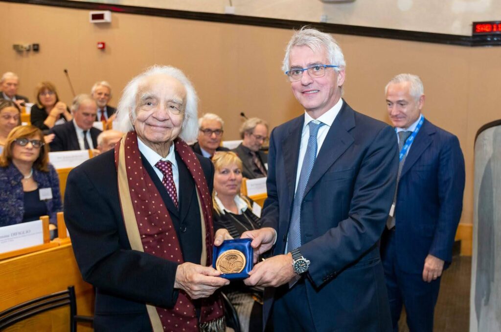 Il prof. Antonino Zichichi riceve dal Presidente INFN Antonio Zoccoli la “Medaglia INFN” in occasione delle celebrazioni per i 60 anni dalla fondazione del Centro di Cultura scientifica “Ettore Majorana”. Fotografia per gentile concessione di EMFCSC, autore N. Lombardi.